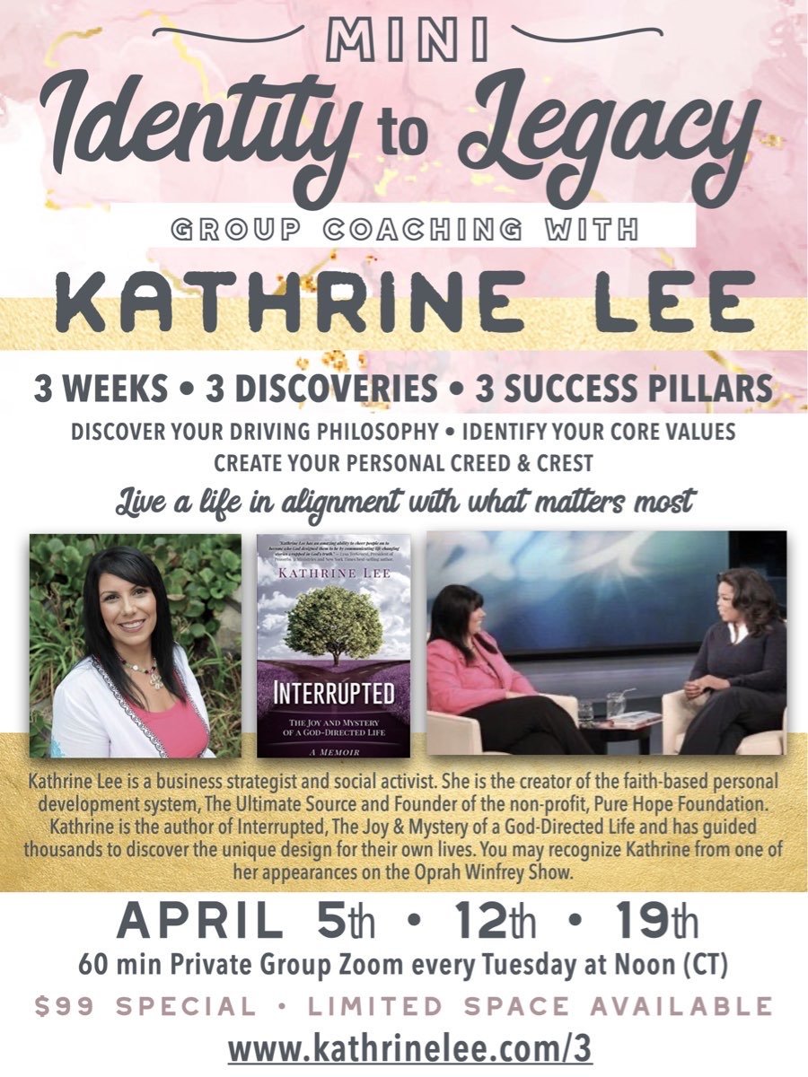 Identity to Legacy with Kathrine Lee is life transforming. As those closest to Kathrine have witnessed her living her identity and legacy everyday, there is no one more equipped to lead you through this journey of discovering who you are and what you most desire to be known for so that you can live out your unique design. Kathrine facilitates a safe, intimate environment of acceptance to foster the vulnerability necessary to uncover the inner hopes and dreams that have yet to be explored, spoken and cultivated. Our group has had an incredible experience of laughter, tears and genuine support in a time when so many are unacknowledged and isolated. I encourage anyone who is looking to live a life of freedom in who they are for the purpose of leaving an empowering legacy to invest in this course for deeper discoveries both individually and collectively. I look forward to giving my best thank you to Kathrine and our precious group by living out what we have uncovered.
